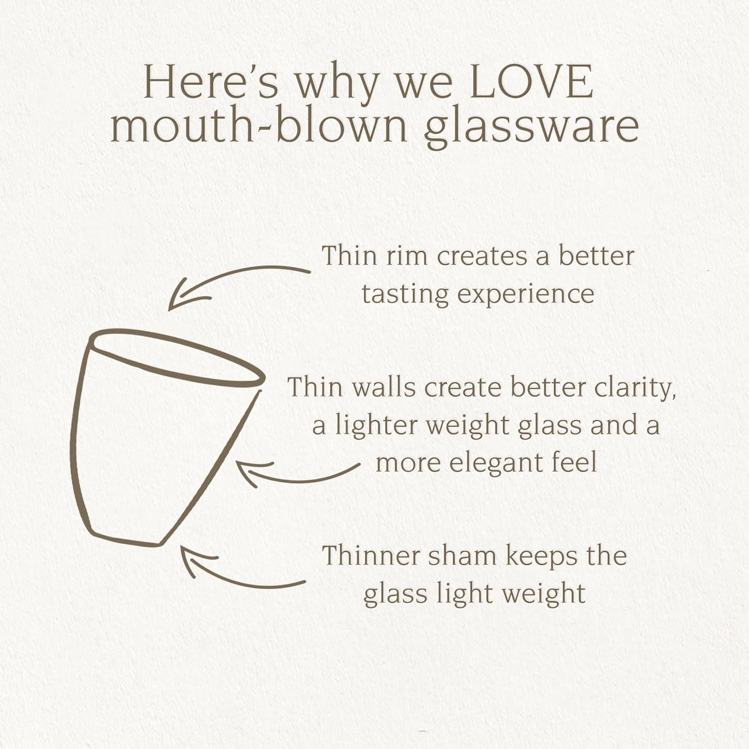 HIGH-QUALITY: Our drinkware set is the real deal and stands out in the quality craftsmanship department. Each cup in this set is made from mouth-blown glass, perfect for wine, cocktails, soft drinks, and more.