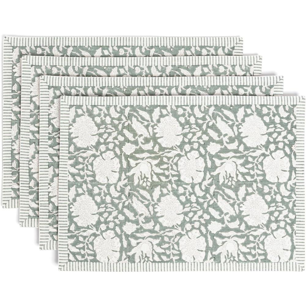 Over&Back Set of 4 Hand-Blocked Placemats - Colorful Dining Table Mat - Each Placemat is Unique - 100% Cotton - Machine Washable - Kitchen and Home Decor - Green Floral