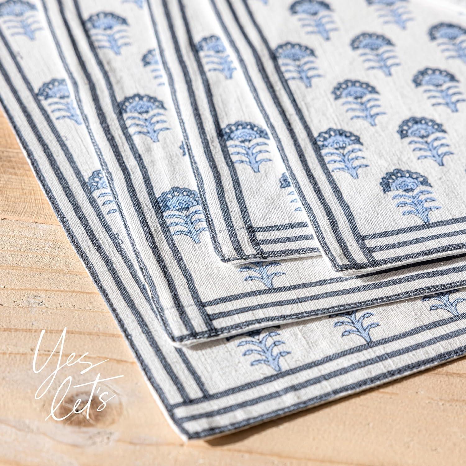 Over&Back Set of 4 Washed 100%-Linen Woven Placemats - Colorful Dining Table Mat - Machine Washable - Kitchen and Home Decor - Blue(Blue Flower)
