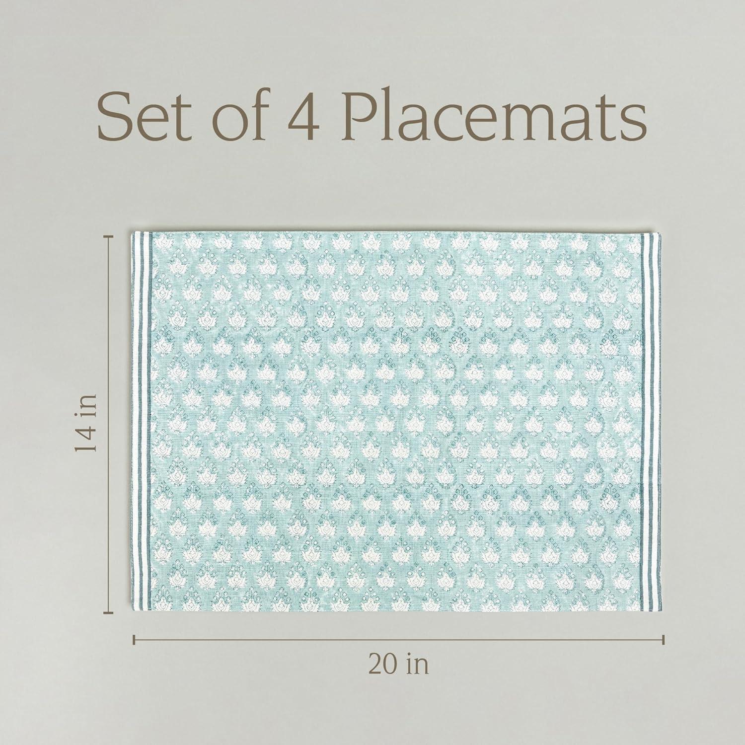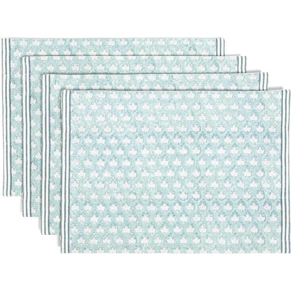 Over&Back Set of 4 Washed 100%-Linen Woven Placemats - Colorful Dining Table Mat - Machine Washable - Kitchen and Home Decor - Blue(Blue Leaf)